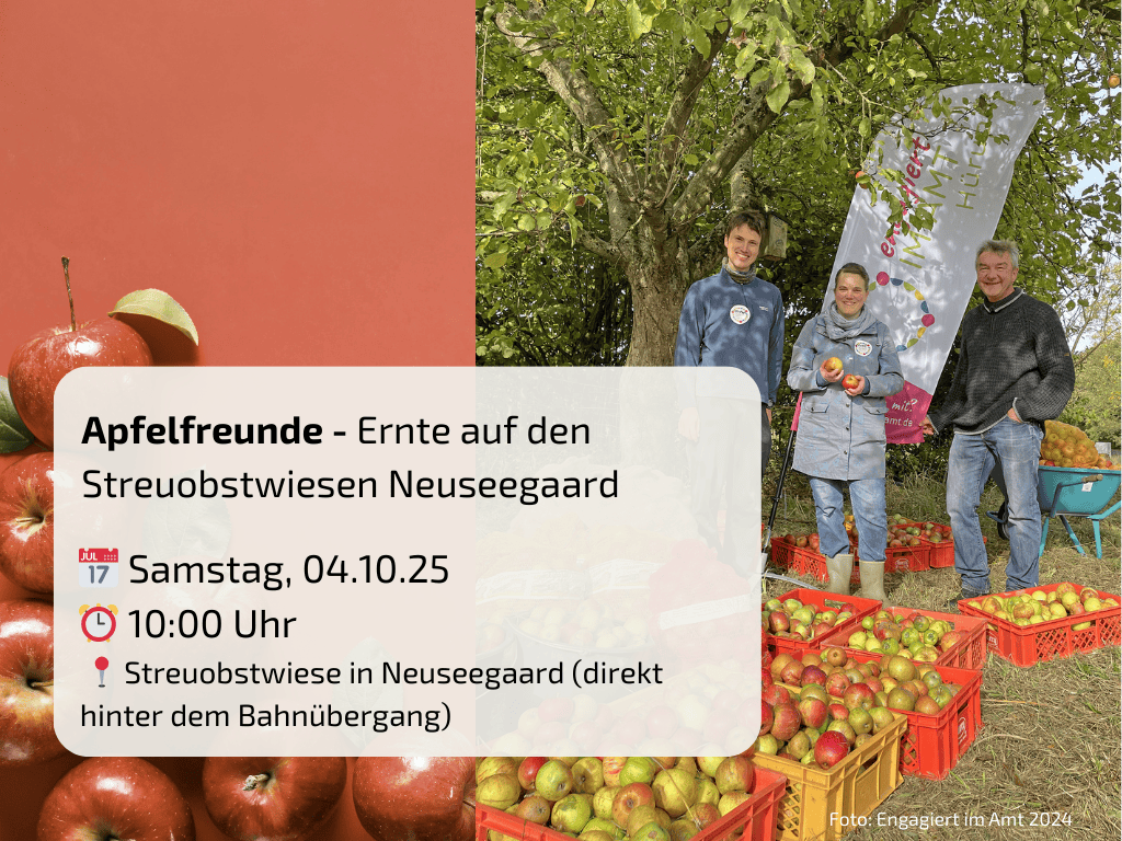 Weil’s so schön war, laden die Apfelfreunde für Samstag, den 04.10.25, ab 10:00 Uhr wieder zur gemeinsamen Apfelernte auf die Streuobstwiese in Neuseegaard (direkt hinter dem Bahnübergang) ein.